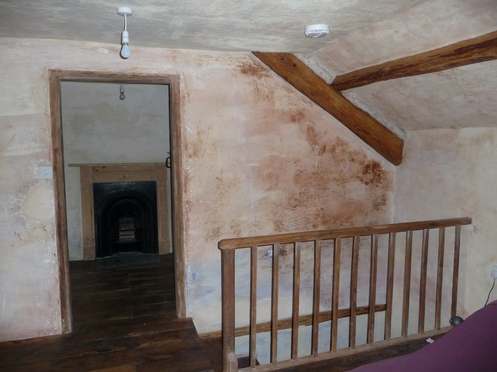 Phase 1: Remove cement and friable materials from exterior walls and internally, remove modern materials (hardboard ceilings, concrete fire surround, paint,) and friable plaster. Making surfaces ready for repair. Take down the delapidated modern brick/concrete block extension on the north gable end.
